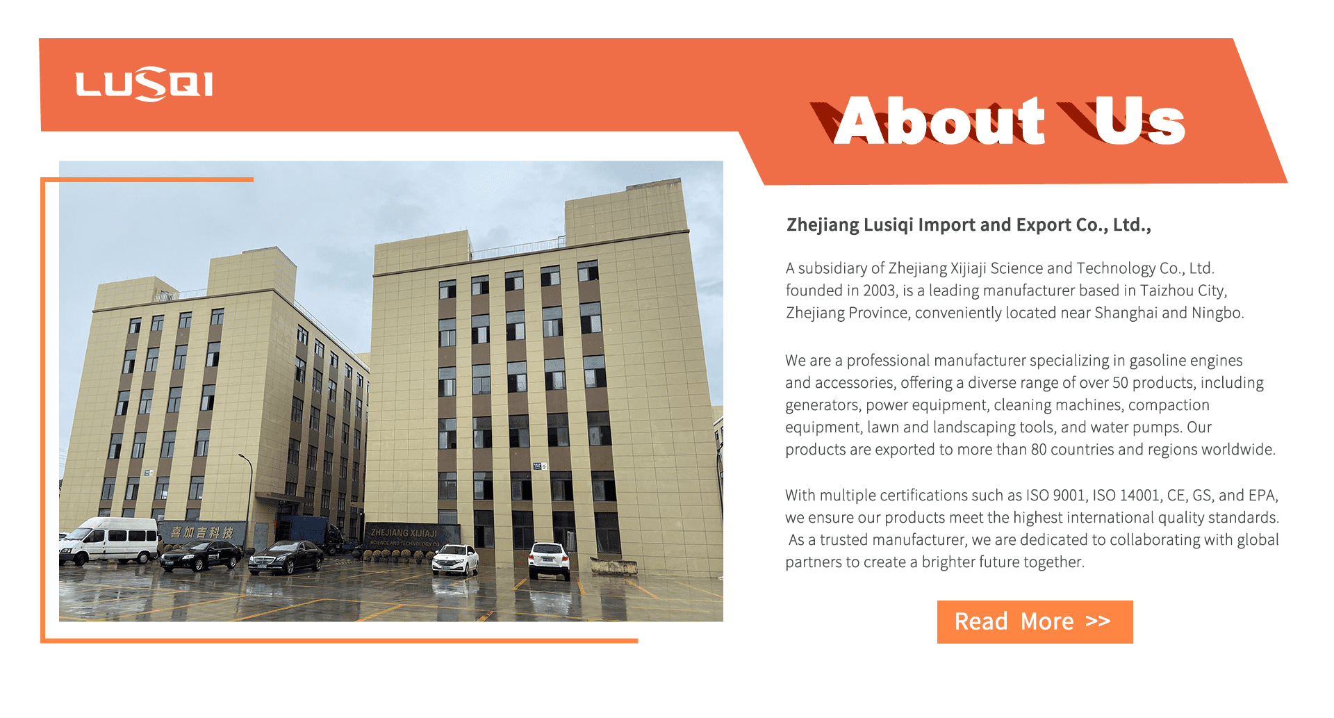 Zhejiang Lusiqi Import and Export Co., Ltd. is a leading manufacturer and factory of high-quality products, recognized as a national high-tech enterprise. Founded in 2003, our company is located in Taizhou City, Zhejiang Province, strategically positioned near Shanghai and Ningbo, with excellent transportation and logistics infrastructure. As a manufacturer, we specialize in producing more than 50 varieties of products, including garden tools, gasoline engines, cleaning machines, agricultural and forestry machinery, drainage and irrigation equipment, and engineering machinery. Our products are well-regarded both in domestic and international markets, exported to over 80 countries and regions worldwide.